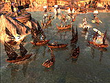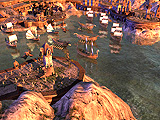 | Hobbitの故郷Shire(庄)が攻撃されている様子。前線で果敢にMountain Giantを攻撃している4人組の姿も | Elfのポートらしいマップ。このような要塞もプレイヤーが全て建設できるのだろうか? 水面の表現も見事 | 左と同じシーンと思われる。コーセイアーの船団が侵攻し,かなり激しいバトルが展開されている様子だ |