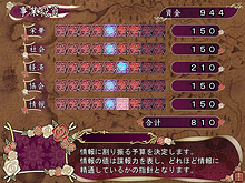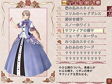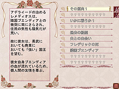 最後に,「コレクション」についても述べておこう。王女には自領の発展に応じて,内政資金とは別に,自由に使用できるお金,いわばお小遣いが与えられる。このお小遣いは,商人から「秘密」や「衣装」,「家具」といったものを購入するために使用する。「秘密」を購入すれば,各キャラクタのプロフィールを知ることができるし,「衣装」や「家具」は,主人公の着せ替えや自室の模様替えに使用すること出来るのだ。プロフィールは,そのキャラクタの信頼を得るためのヒントが記載されていることもあるため,積極的に購入していきたい。一方で,衣装や家具は完全におまけ要素。購入して身に付けたり部屋の模様替えをしても,本編のCGに反映されるわけではない。しかし,購入品目は全てリスト化されるので,リストを埋めていく楽しみを見出すこともできるのだ。