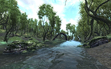 Shivering Islesの大きさはCyrodiilの4分の1程度である(Oblivionをプレイした経験のない方のために,キャラクターを走らせて実時間を計測した。島の外周を道なりに一周して約15分。諸々の条件によってスピードの増減はあるが,目安として捉えて頂きたい)。この島は南北で様相が異なる。南側が,視認性が低く陰湿な沼地が点在する「Dementia」サイド,そして北側が,シュールで色彩豊かな植物が生い茂る「Mania」サイドとなっていて,それぞれが独自の雰囲気を持っている。