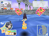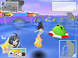 カーソルキーの左右を連打すれば,とぅいんくるが赤く光って一時的に加速する(ダッシュ) | 急なカーブは,カーブ手前で軽くジャンプして空中で身体の向きを変えると,うまく抜けられる | かわいいカエルのフロート……だが,もちろん激突すると,大きなタイムロスになってしまうので要注意! |