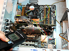 まず,表1に示した評価用システムを,Cooler Master製のスチール製ミドルタワーケース「Centurion 530」に組み込んだ。この状態で,ForceWareに付属するユーティリティ「nTune」,あるいはCatalystの「Catalys Control Center」からGPU温度をチェックし,さらに,横河M&Cのデジタル放射温度計「53005」を用いて,カード各部の温度を計測することにしている。