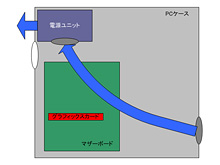 | 左は計測のイメージ。分かりやすいよう,ここでは電源ユニットなどを取り外している。実際の測定環境は右の図を参考にしてほしいが,ケース前面の120mm角ファン(回転数1200rpm)で吸気された風が,底面120mm角ファン×1(自動変速)という仕様のSkyHawk製の定格600W電源「GM-600WP-R」から排気されるという,一方通行的な配置とした。ケース背面ファンは用意していないので,一般的なPCケースよりはやや厳しい温度環境になる。簡単な模式図を右に示したので,参考にしてほしい。図中,灰色の楕円はファン,青い矢印はエアフローを示している。 |