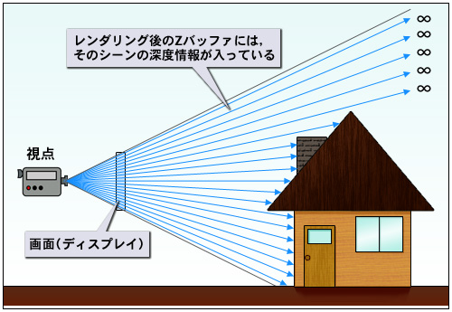 この手法では,シーンをレンダリングした際に結果として残るZバッファの内容を利用する。Zバッファは重複描画を避けるためにレンダリング時に描画成功した画素に対応する深度情報を記録するためのバッファだが,シーンのレンダリングを終えたZバッファには「そのシーンの奥行きがどれくらい開けているか」に相当する情報がピクセル単位で記録されている。