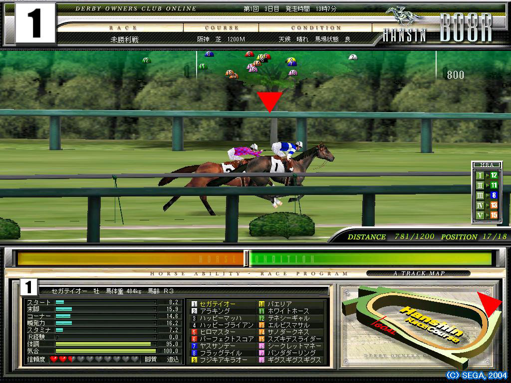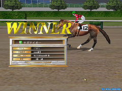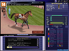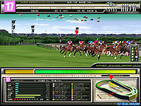 ある程度調教に慣れて自信がついたら,いよいよレースに出走だ。競馬場に行って,愛馬の条件にあったレース(最初は新馬戦か未勝利戦)をクリックして,登録されるのを待とう。ほかのプレイヤーの登録,あるいはプレイヤーが少ないときはコンピュータが用意した馬を交えてレースが始まる。