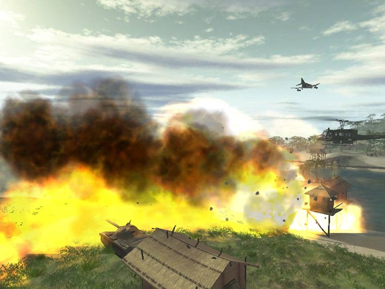 これらの密林の表現は,スナイパー系には不利になるように思えるが,自分の居場所も特定しづらくなるということで,Battlefield 1942とは違ったプレイが要求される。ジープやタンクなど地上兵器を使った戦闘ができる地域が限られてくるため,プレイヤーが臨戦状態におかれる確率も飛躍的に向上するだろう。また,東南アジア風の小屋などの建物もマップ中に点在しているが,中には切り出された材木を坂道に転がして敵にダメージを与えたり,一時的に侵攻を食い止めたりといった戦略性のあるオブジェクトもある。