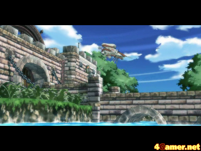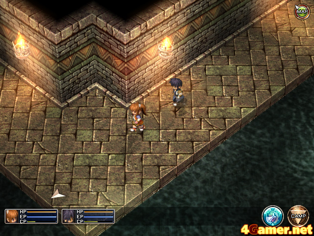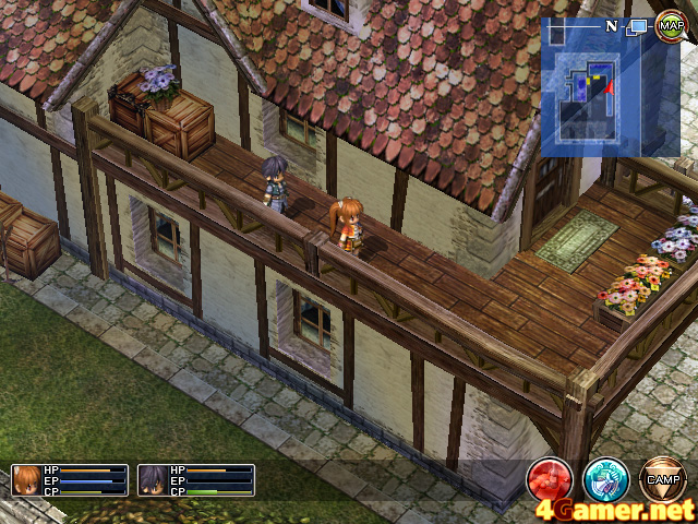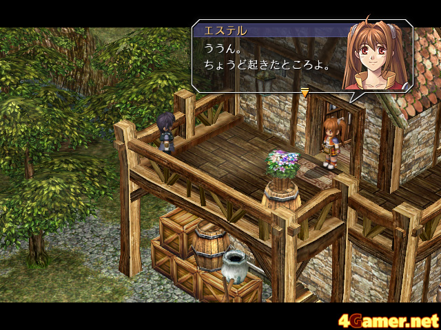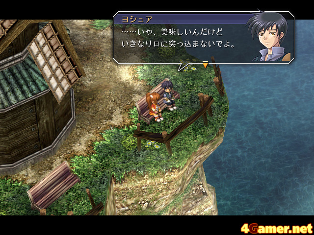 英雄伝説VIは,2003年に発売された「イースVI」と同様,ゲーム世界は基本的に3Dで描かれている。しかもイースVIはプリレンダだが,英雄伝説VIはリアルタイム生成。これにより,前作に比べ格段にグラフィックスが美麗になり,とくに演出面での表現力のアップには目を見張るものがある。どちらかというと,ダイナミズムよりも緻密さに主眼を置いた画面作りがされており,世界全体のリアリティ向上や,町や建築物に強い存在感を持たせることに成功しているのだ。このあたり,洋ゲーの3Dグラフィックスの使い方とは微妙にベクトルの違う演出コンセプトをうかがうことができ,なかなか面白い。