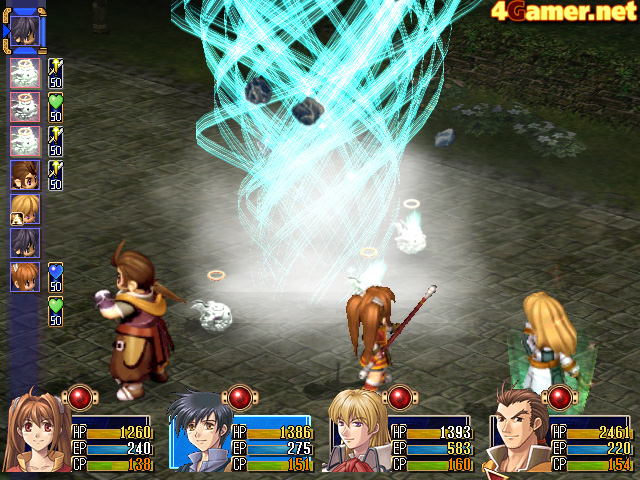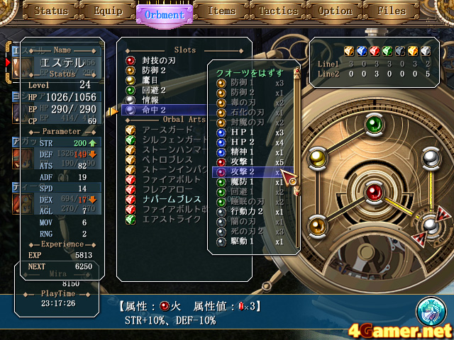また,いわゆる「やり込み」のための要素も豊富に用意されている。魔獣を倒すと"セピス"という宝石を落とすのだが,これを集めて加工することで"クオーツ"と呼ばれるアイテムを作り出せる。さらにクオーツ同士を組み合わせ,各キャラクターが持つ"オーブメント"にセットすることで,各キャラクターの能力や使える魔法が変化する。クオーツの組み合わせはゲーム中にいつでも変えられるので,ひたすら特定のキャラクターをパワーアップさせたり,パーティの中での役割分担を考えたりと,さまざまなカスタマイズを楽しめるわけだ。