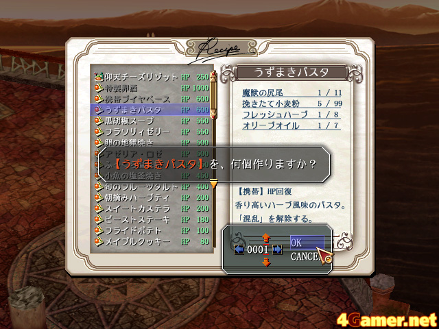 料理システムも面白い。ゲーム中,主人公達は各地を訪れ,酒場やレストラン,屋台などでさまざまな食べ物を入手できる。これらの食べ物は回復アイテムになっているのだが,一度食べればレシピを覚え,材料さえあれば自分でそれを作れるようになる。材料は各地で購入できるほか,魔獣を倒して手に入れることも可能だ。レシピをコレクションするだけでも「ぶらり食べ歩き」みたいな感じで楽しいうえに,普通に回復アイテムを買うより経済的という実利もある。