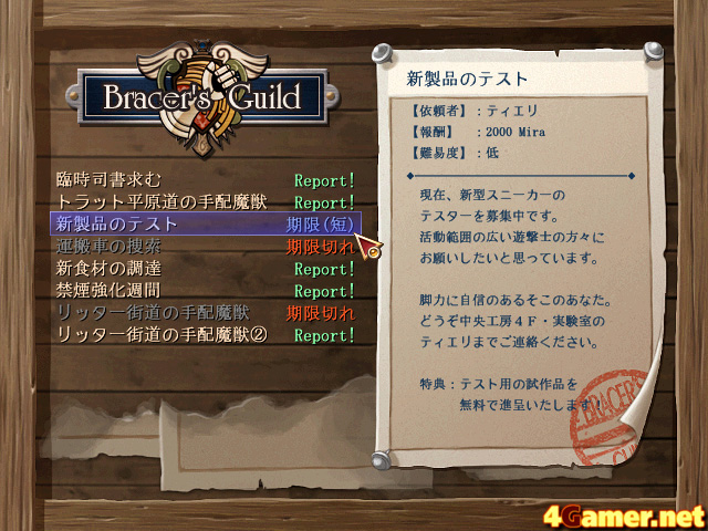 | 各地で獲得できる料理は回復アイテムとして使える。レシピを覚えると,自分で料理する(作る)ことも可能だ | 町の遊撃士支部では,さまざまな依頼を受けられる。報酬やBP(ブレイサーポイント)を得られるチャンスだ | 遊撃士の持つブレイサー手帳は,冒険の必需品。何をしたらいいか迷ったときには,まず参照するといい |
