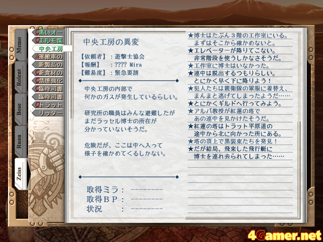 さらにゲーム中,主人公達は遊撃士として数多くの仕事の依頼を受ける。依頼内容は魔獣退治や護衛任務,探し物の捜索に犯罪の捜査などなど,実にバリエーション豊かだ。これらをこなしていくと報酬がもらえ,遊撃士としてのランクも上がっていく。これらはサブイベントということで,メインストーリーの展開とは直接関係はないが,遊撃士という存在が大きな意味を持つ英雄伝説VIの世界観に,深みを加える一因となっている。