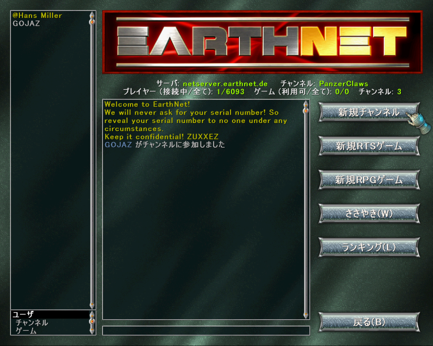 | RTSモードやRPGモードのネット対戦が楽しめる「マルチプレイ」。写真はメインサーバの「EARTHNET」