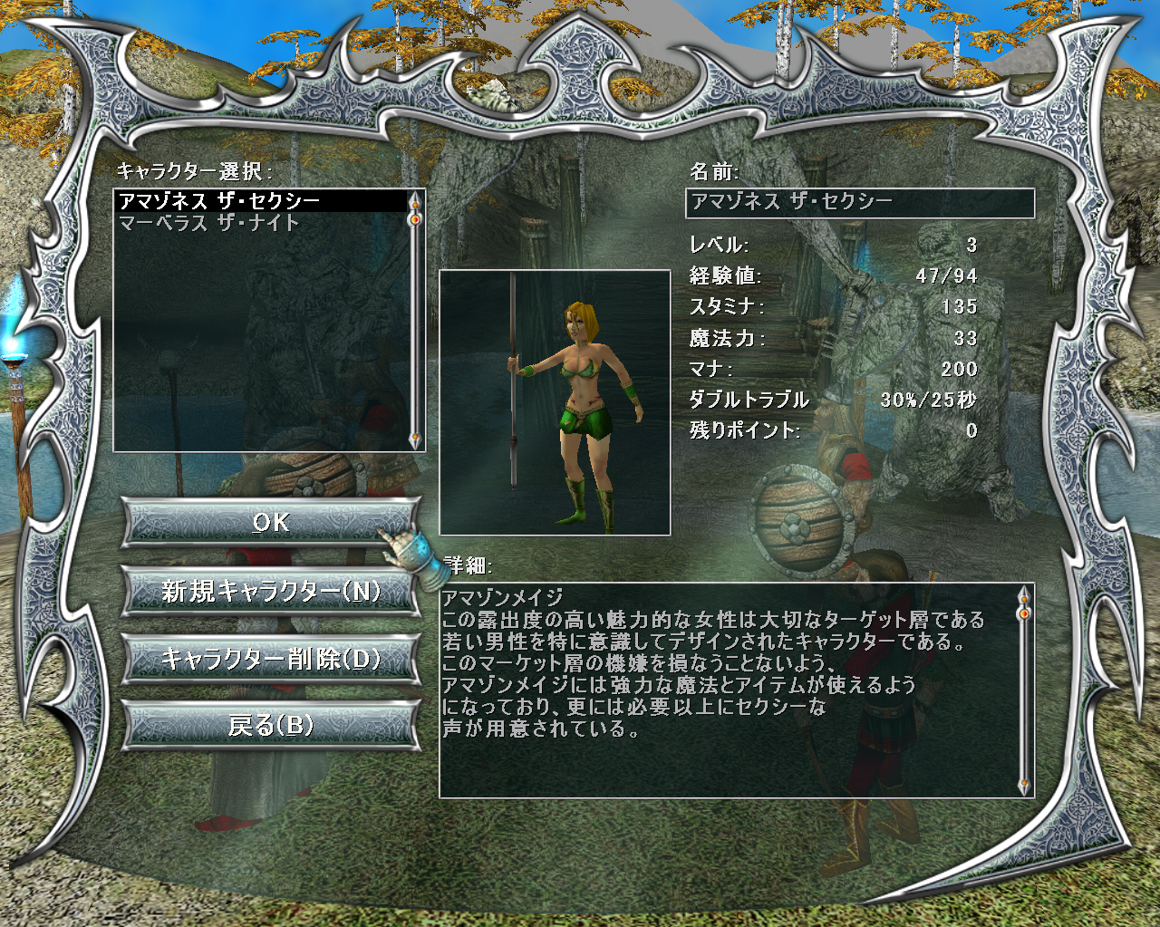 | RPGモードでは,デフォルトの7人の中からプレイキャラクターを選ぶ。写真は開き直りがイカス「アマゾンメイジ」