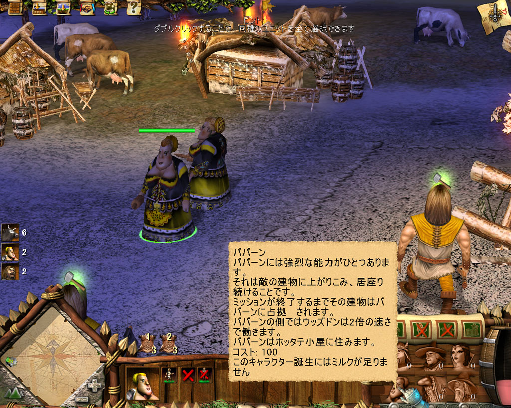 ちなみに登場するユニットの名前も,「ウォリヤン」(戦士)や「アーチャン」(弓兵),「ババーン」(読んで字のごとくおばちゃんキャラで,敵の施設を図々しく占領するという特殊なユニット)など,ちょっと腰の力が抜けるものとなっている。