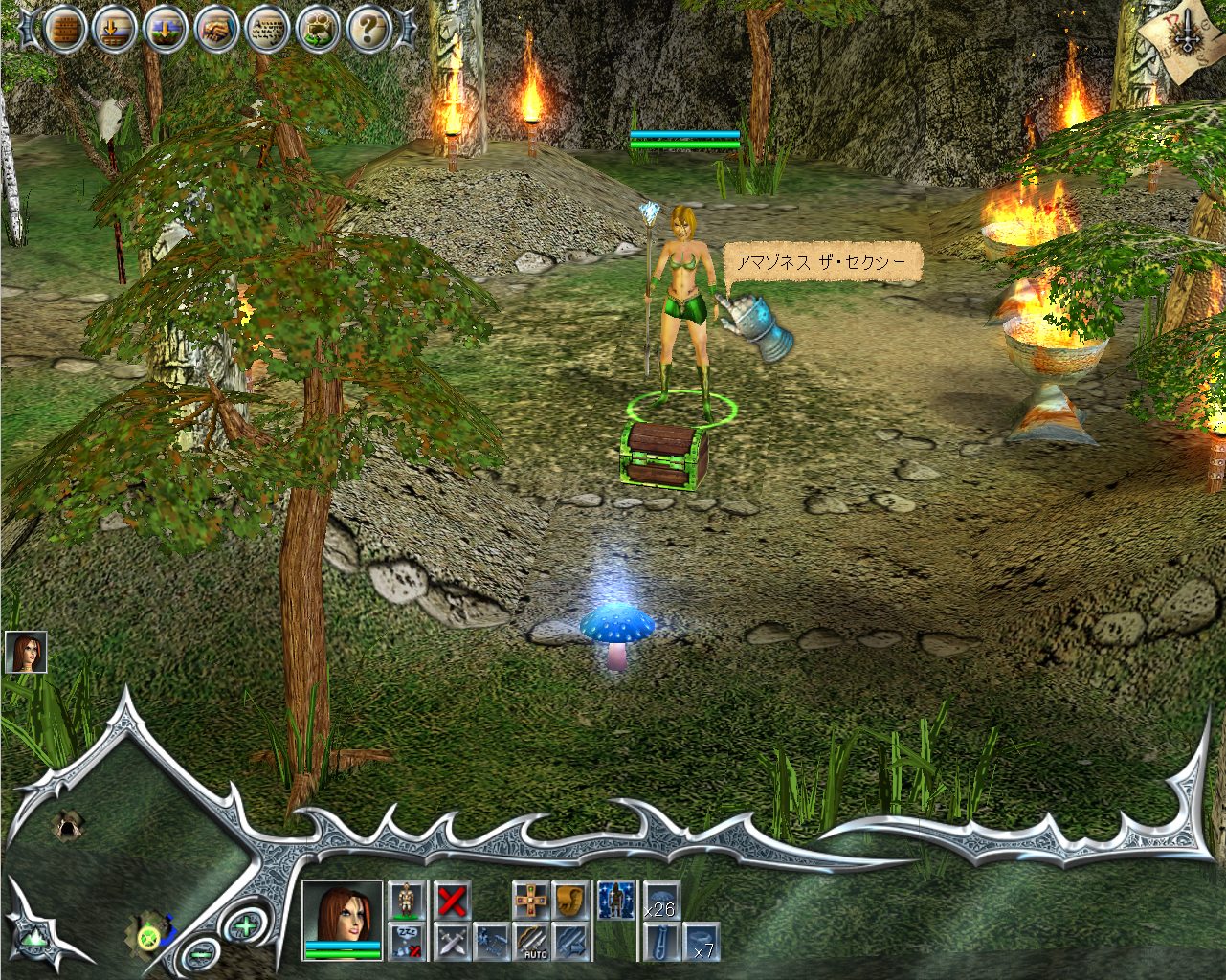 一方RPGモードは,「ハンター」や「ナイト」などデフォルトの7人のキャラクターのうちから一人を選び,戦闘で経験値を稼ぎながらミッションをクリアしてストーリーを追う,これまた"馴染み深い"システムだ。ちなみにシナリオは関連性のあるものやないものを含めて,全部で18本用意されている。RPGモードは登場する7人のキャラクターの解説がいちいち皮肉なところが面白く,とくにセクシーな「アマゾンメイジ」は,「この露出度の高い魅力的な女性は,大切なターゲット層である若い男性をとくに意識してデザインされたキャラクターである……」と,冗談とも本気ともつかない解説がされており,まさに冒頭に書いた「うひょ」好きなゲーマーにはたまらない部分なのだ。