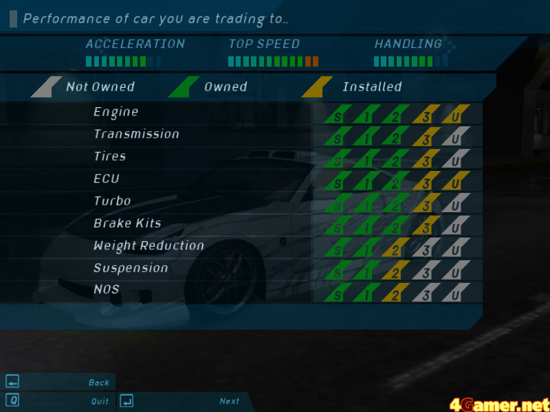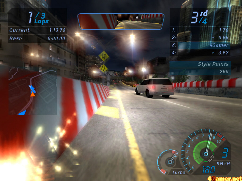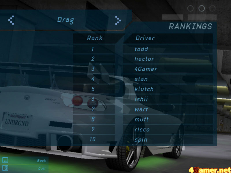 クイックレースは,各レースモードを選択してプレイできるので,練習に最適だ。バトルもタイムリミットもないフリー走行もあるので,ノンビリと市街地を流したり,ショートカットやライン取りの練習をすることも可能だ。 プレイオンラインは,EA GAMESオンラインサービスに接続して(EAのアカウントが必要),2〜4人でのマルチプレイが楽しめるモード(1.4.0パッチ「こちら」が必要)。 ロビーサーバーでは,普通のチャットはもちろん,対戦相手を探して挑戦状を叩きつけることも可能だ。 アンダーグラウンドモードで作り上げた車は持ち込めず,オンラインカーメニューから車を選んでプレイできる(カスタマイズは可能)。 プレイヤーを熱くさせるのが,評価ポイント(REP)のトップ100のランキングと,今週のベストタイムが掲示されているところだろう。レースに勝つと評価ポイント(REP)が増え,負けると減る。これがランキングされ,単純だけど熱くなれるシステムとなっている。対戦相手のデータを見つつ,勝てそうな相手がいれば挑戦を申し込んでみよう。逆に挑戦を申し込まれることもあり,承諾すればレーススタートだ! またランキングに関係なくマルチプレイを楽しめるモードも用意されているので,気軽に遊びたいときも安心だ。