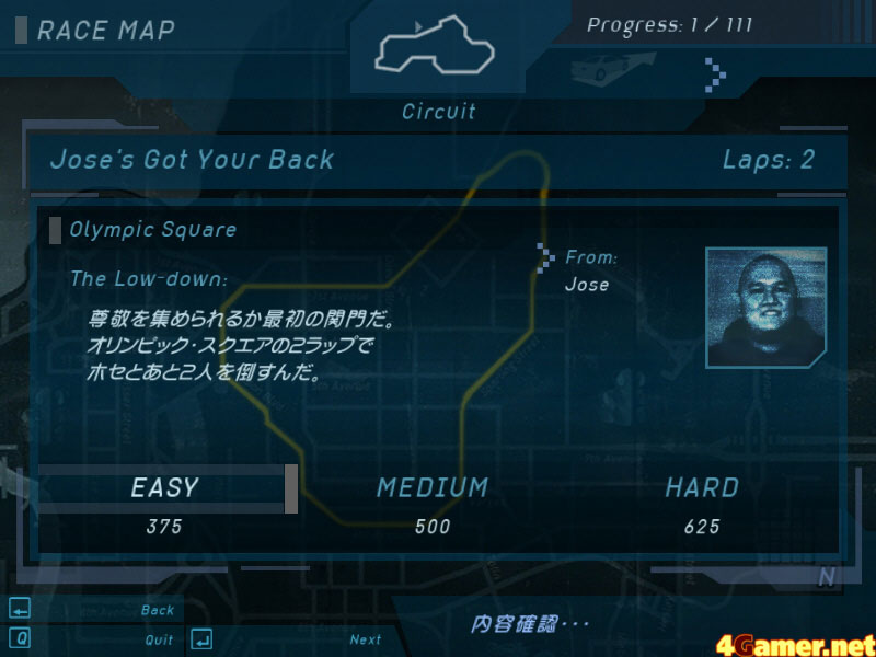 アンダーグラウンドはいわゆるキャリアモードで,市街地で開催される数多くのイベントに参加し,勝ち抜きながらカリスマレーサーのトップを目指す。最初はノーマルの小排気量の車でレースに参加し,レースに勝つことで手に入れた賞金"Bank"で愛車をカスタマイズしていくのだ。 レースはすべて夜間の市街地コースで行われ,レースイベントごとにサーキット,スプリント,ラップノックアウト,ドラッグ,ドリフト,トーナメントで行われる。全部で111レースにもなるので,すべてのレースを制するには相当な努力が必要だ。とはいえ,各レース開始前にEasy,Normal,Hardと難度を選べるので,腕に自信のない人も安心。 それでは,各レースがどんなものか簡単に列挙しておく。