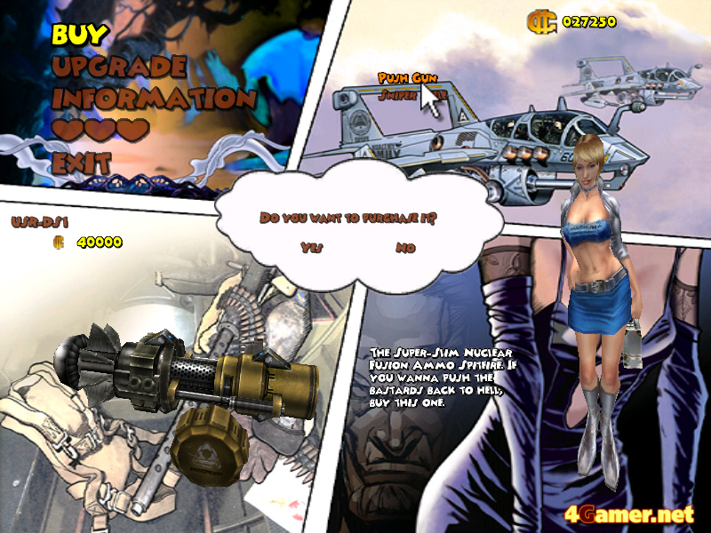そしてそのポイントを使用して,セクシーな武器商人のリサから特別な武器を購入したり,所有している3種類のメイン武器をアップグレードしたりできる。特別な武器とはグレネードランチャー,プッシュガン,スナイパーライフル,ニトロミサイルといったところ。