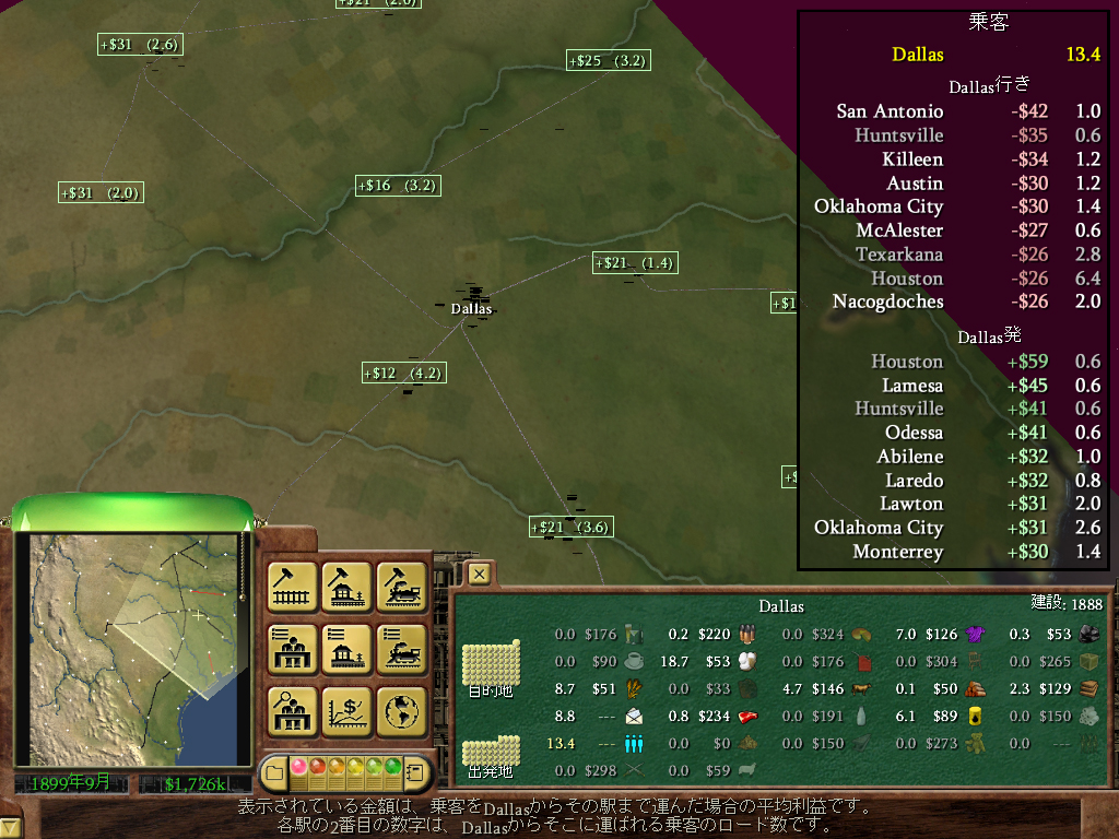 | フィールドが赤→緑の順に価格が高くなっていく。物資を安く買えるところで積み,高く売れるところで降ろすというのが基本的な戦略となる | 乗客は目的地へ向かう列車にしか乗らない。この画面を使えば,乗客をどこにどれだけ輸送できるのかが一目で分かる | こうして見ると,いかにロッキー山脈が難物かというのがよく分かる。この手強い山脈をどうやって越えるかは,プレイヤー次第だ |