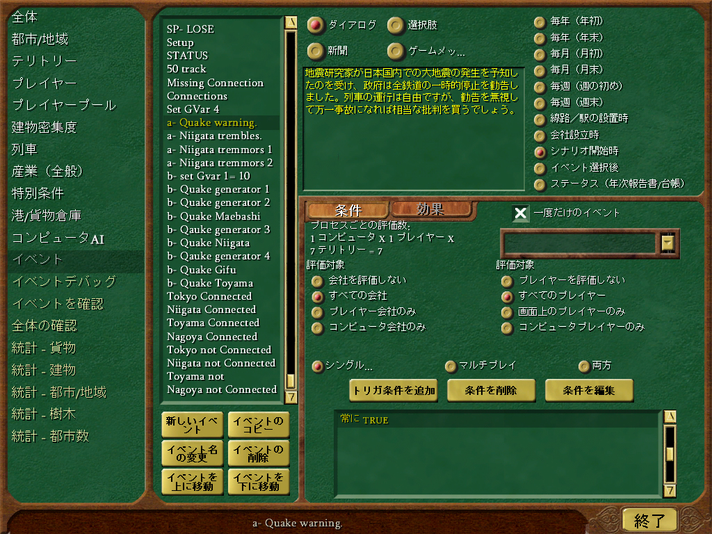 目的はミッションごとにさまざまなものが用意されていて,会社の利益や資本を一定の額までもっていくもの,個人資産を蓄積するもの,一定時間内に決まった貨物を目的地まで運搬するもの,などがある。マップは,キャンペーンと個別のシナリオを合わせて28個用意されており,マップに設定された目的を達成することを目指してプレイする通常のゲームモードに加えて,経済的な要素をすべて排除し,自由に線路を引き列車を走らせて遊ぶことのできる「サンドボックス」モードの2種類のモードでプレイすることが可能だ。ほかに,マップエディタとシナリオエディタが付属している。これらは直感的なインタフェースになっており,とても使いやすい。