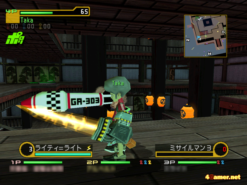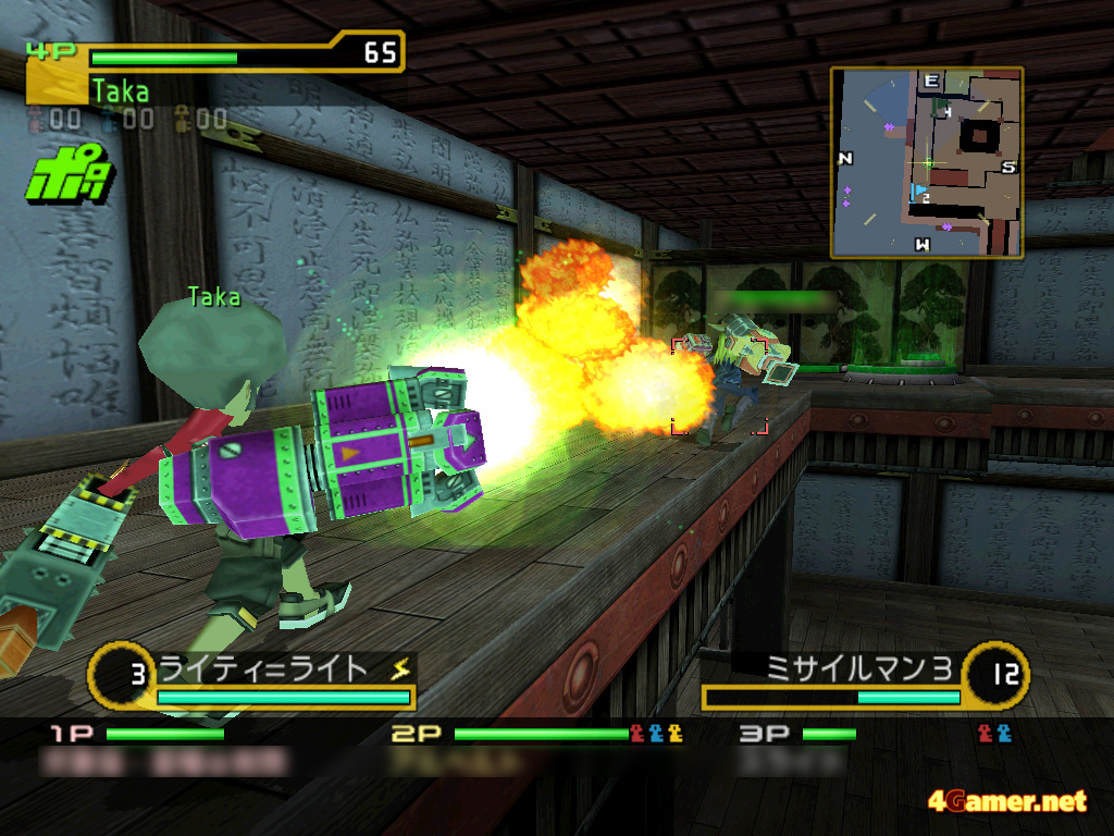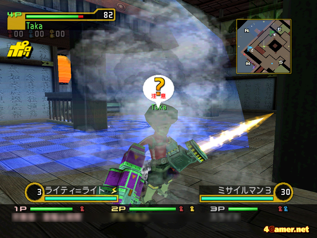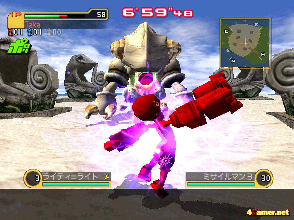 なんだか身長よりもでっかいミサイルが飛んできた! 速度が遅いのでなんとか回避。それにしても,いろんなアームズがある |