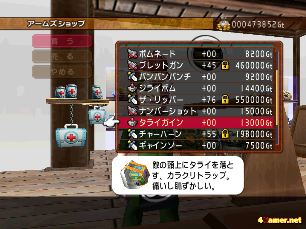 ゲームを進めていくと,どんどんショップで売っているアームズの品揃えが増えていく。初期装備でマルチプレイ挑戦は,無謀! |