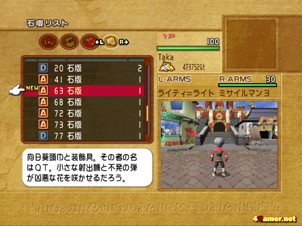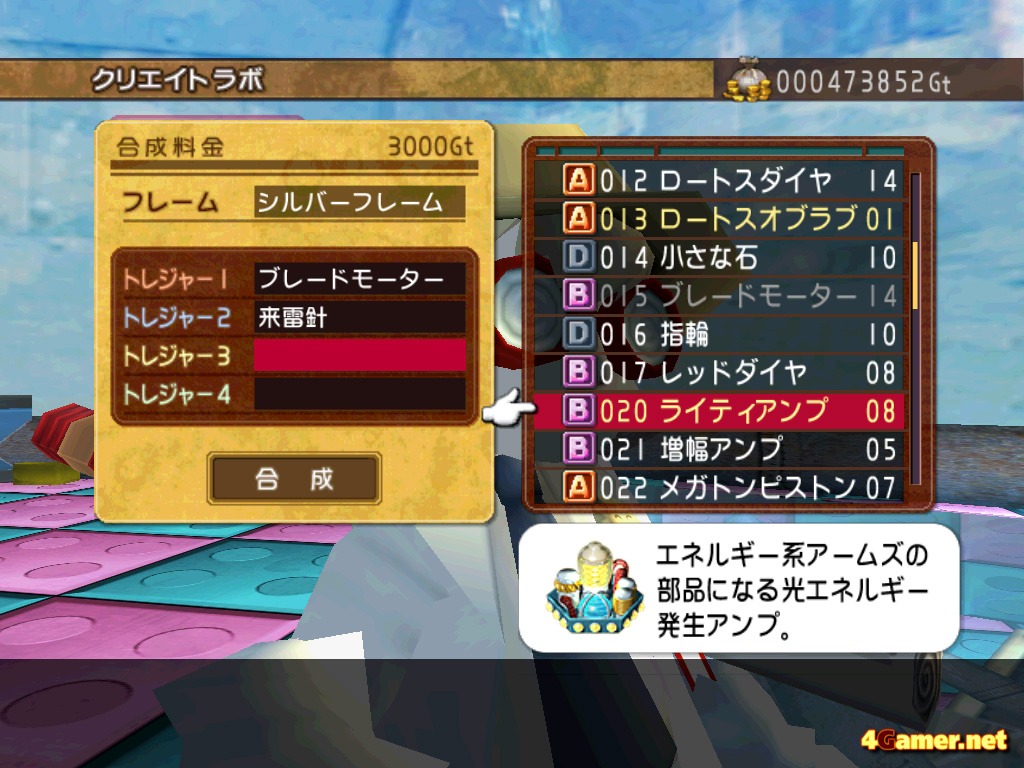 ゲーム中盤くらいから面白いと感じたのは,このトレジャーの合成だ。収集したトレジャーは,あるパターンで合成すると,新アームズが作成できる。レアなトレジャーを組み合わせると,高性能だったり面白い効果のアームズが出来たりする。