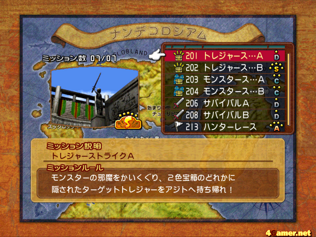 というわけで,ある程度の武器を揃えてマップを覚えるまで,最初はシングルモードで遊び込むのがメインとなる。序盤のマップをクリアしつつ,トレジャーをしこたま集め,ギルドで交換できるものはじゃんじゃんポイントに換算。ハンターレベルを上げて新マップを遊べるようにしつつ,さらにトレージャー収集。集まったトレジャーを合成して,新アームズ(武器)を作ったり,お金を貯めて購入したり,強化したり。こういったRPGっぽい感じで進めつつ,ゲームに慣れていくわけだ。