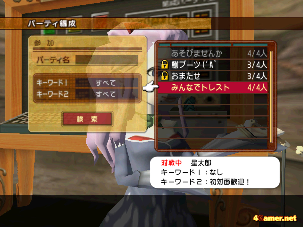 マルチプレイは,まず酒場でパーティを作ったり検索する。1パーティは最大4人まで。つまり一度に最大で4人対戦となる |