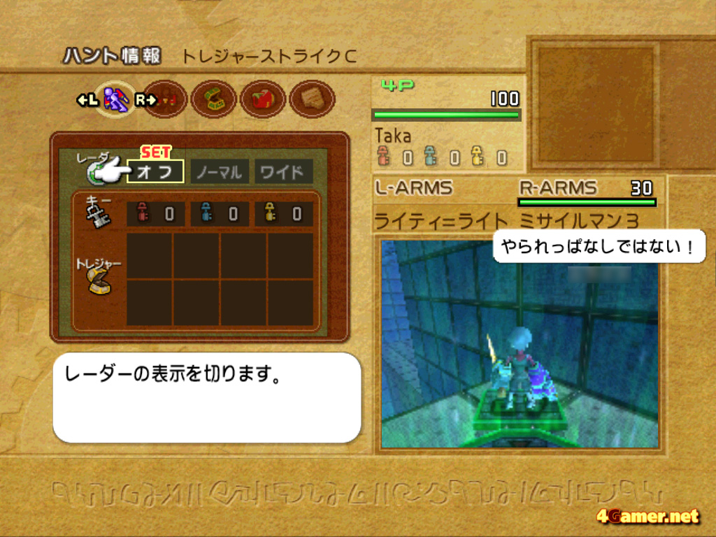 | 集めたトレジャーを組み合わせて,新しいアームズを作る。これをアレコレ考えたり調べたりするのが楽しい |