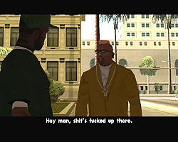死んだはずのTorenoの計らいで監獄から出られることになった,兄のスィートを迎えに行く主人公カール・ジョンソン(CJ)。「兄貴,久しぶりメーン。無事でよかったガッデム。さあ,家に帰ろう。洋服も買ってやるよ」というCJに「家ってどこだ?」と聞き返す兄。今や,サン・フィエロで手広く事業を行ない,ラス・ベンチュラの巨大カジノの共同経営者となったCJにとって,山の手にあるベッドルームだけで19部屋の豪邸が彼の家。だが,スィートは「グローブ・ストリートが俺の家だファッ○!」とCJを優しく叱るのだ。「兄貴。世の中はグローブ・ストリートなんかよりずっと広いんだぜアスホール」と反発するCJだが,やがて兄に従い,懐かしの我が家に帰ることを誓う。ジョンソン兄弟の熱い郷土愛が伝わって,思わずホロリとする場面である。帰って何するか,っちゅうとアレなんだけど。