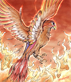 フェニックスといえば転生することが有名で,500年ほどで生まれ変わる「神鳥」とされている。フェニックスは死期を悟ると,香木を積み上げて自ら火をつける。炎に焼かれたフェニックスは一旦は液状化するものの,やがてそれが集まり,新たなフェニックスとして再生するのだという。