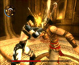 前作SoTで,プレイ開始当初に「うぉ,かっけぇ!」,プレイ中盤で「うぉ,単調!」という評価を受けた戦闘アクションが改めて進化した。敵の頭上を飛び越えて敵を切りつける技は健在,さらに今作からは二刀流が加わったため,複数人を相手にする場合の回転系コンボや,左右から敵の首を挟み込んで刎ねるといった,ビジュアル系の技までも加わっているのだ。今作の主人公は,頭にターバンを巻いてヘッピリ腰で戦っていたPrinceの存在を根底から否定するように芸達者なのである。