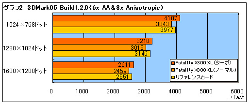 まず,「3DMark05 Bulid1.2.0」(以下3DMark05)の総合スコア(グラフ1,2)から見てみよう。Fatal1ty X800 XLのノーマルモードは,リファレンスカードに比べてスコアが3〜4%低いのが気になる。同じスペックでありながらFatal1ty X800 XLのノーマルモードが明らかに低いスコアである理由は不明だが,オーバークロックを前提に,メモリアクセスのレイテンシを大きく取っている可能性はある。