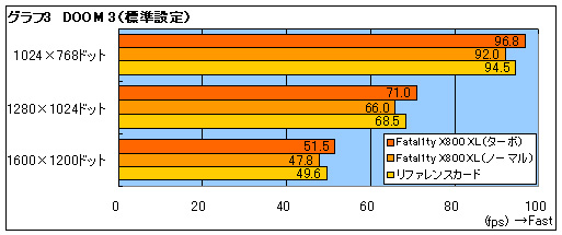 次に「DOOM 3」のTimedemoを利用し,平均フレームレートを計測してみた(グラフ3,4)。