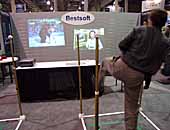 今年の東京ゲームショーの韓国ブースでひときわ人気を集めていたBestsoftの「Body Diet Dancing(BDD)」が,ラスベガスCOMDEX FALL 2000にも展示されていた。名称にDancingとあるもののダンスゲームのフロアコントローラではなく,実は格闘ゲーム向けコントローラである。 両手両足を伸ばしたあたりにモーションセンサーが仕掛けてあり,それぞれがパッドのボタンにアサインされる。例えば右パンチを出そうとしたら実際にシャドウボクシングみたいな感じで右パンチを前方に向かって繰り出すわけだ。キックも同様に,足を前に蹴り上げるアクションをすればいい。ソファに座ってできるゲームをあえて全身でやるから"Body Diet"というわけ。