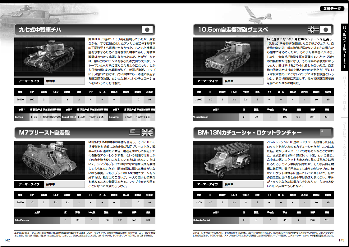 - 第3章:データ集……全兵器データ,全武器データ,さらにアーマー表やダメージ表など実用的な情報に史実知識を加えて掲載