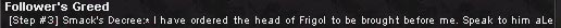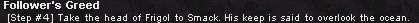 「おぉでかした。なるほどFrigolの首か。そいつは,南西に向かった場所にあるTomtar Campを仕切っている男だ。その首をもってSmackを欺き,そして奴を倒すのだ」
