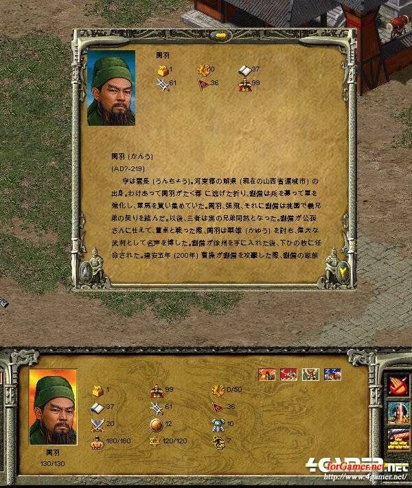 ご存じ「関羽」。このゲームでは,武将一人ひとりに説明文が用意されているのだ。読んで楽しむのもまた一興