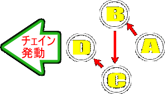 下の図を見てほしい。AがBに,BがCに,CがDに"チェイン"をかけて,最後にDがスキルを発動することによって,とてつもない攻撃力を生み出すわけだ。