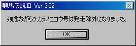 仕上がり状態の悪いワザノイチゴウはもう少し調教に専念することにして,ジッケンクンとチカラノニゴウを出走させることにする。何しろこのままだと,どうにもこうにも記事が展開できない(笑 彼女いない歴20年以上限定 みたいで微笑ましい。