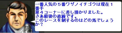 筆者:「連載内容はどんな感じにすんべ?」 すっかり忘れてまちた ちょっとだけフォローしておこう。えーと,ブリーダーズカップがあったらしいです。 凄い激闘が繰り広げられました。 まる。 セーフ? あ,一箇所だけ公式ページにそれらしき記事があるじゃん。リンク貼っとこう。 意味ないじゃん(>< まぁ,これでだいぶ筆者の生き様を理解していただけたかと =D (編注:「ここ」にまだ残ってるし,「ここ」から結果も見られます)で,またちょっと月日が流れたと思いねぇ。いつものようにゲームを立ち上げる。さて,今日も無事除外されたかな?