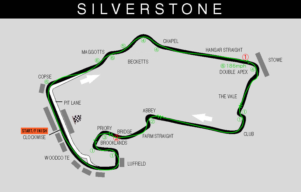 ストウコーナー(図中STOWE)は,シルバーストーンの難所として知られる。