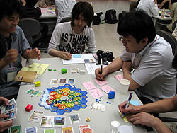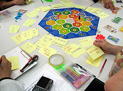 ワークショップでは,参加者が七つの班に分かれてカタンをプレイし,