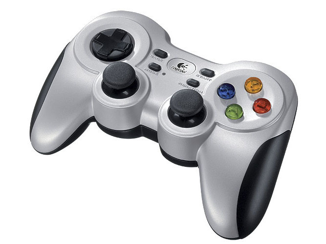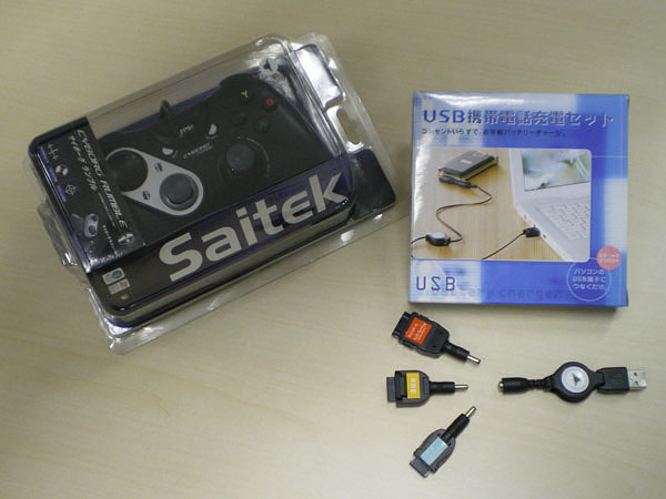 オンラインフライトアクション「Heroes in the Sky」(PC)のロゴシールが貼られたSaitek製ゲームパッド「Cyborg Rumble」(レビュー記事)&携帯電話充電ケーブルです。