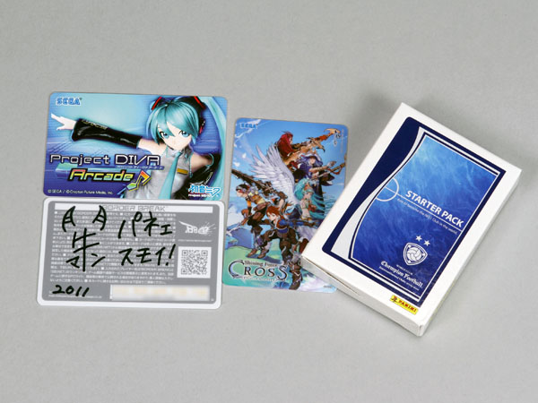 セガのアーケードタイトル「WORLD CLUB Champion Football Intercontinental Clubs 2009-2010」のスターターパックと,「初音ミク Project DIVA Arcade」「シャイニング・フォース クロス」「ボーダーブレイク エアバースト」のICカードセット。ボーダーブレイクのカードは牛マン氏のサイン入りです。