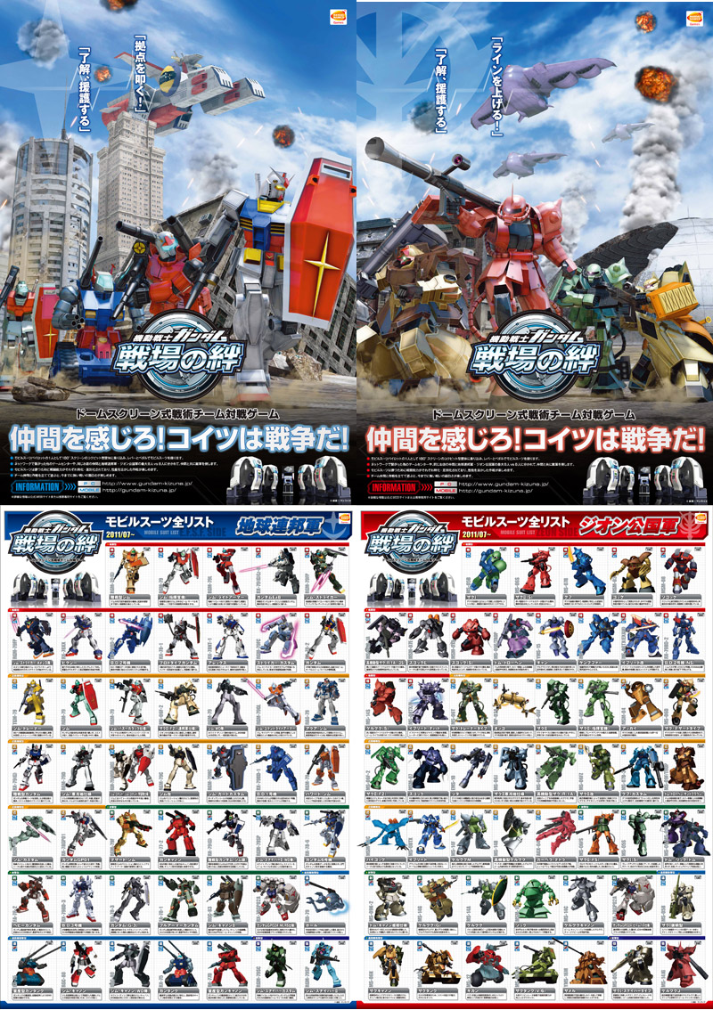 「ドームスクリーン式戦術チーム対戦ゲーム 機動戦士ガンダム 戦場の絆」REV.3ポスターと,2011年7月時点のモビルスーツリストポスター(いずれもB1サイズ)です。それぞれの地球連邦軍バージョン,ジオン公国軍バージョンをセットにして,計4枚をお届けします。