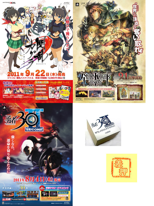 「閃乱カグラ -少女達の真影-」(3DS),「グランナイツヒストリー」(PSP),「勇者30 SECOND」(PSP)の非売品ポスターと,勇者30 SECONDの「差し押さえ」スタンプをセットにしてプレゼントします。