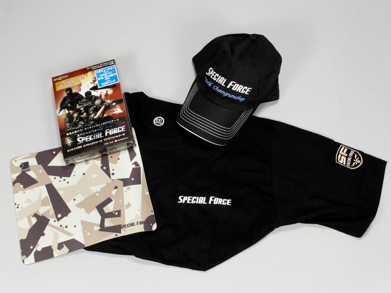 オンラインFPS「SPECIAL FORCE」(PC)の特典アイテム付きクライアントパッケージ(関連記事)と,オリジナルキャップ,Tシャツ(サイズ:XXL),ロゴ入りマウスパッド(サイズ:250(W)×215(D)×2(H)mm)のセットです。
