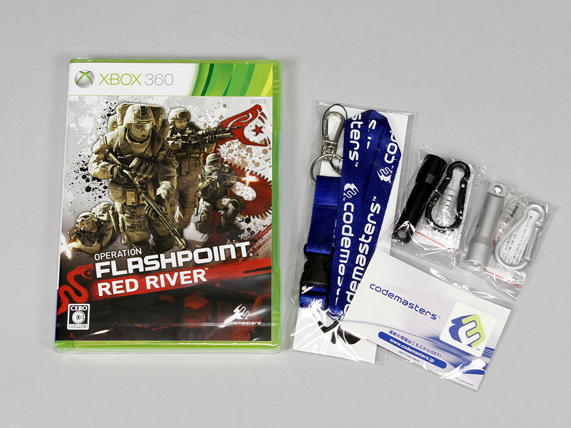 ミリタリーFPS「OPERATION FLASHPOINT」シリーズの最新作(PR記事)と,コードマスターズオリジナルLEDライト2種,ネックストラップ,携帯電話クリーナーのセットです。