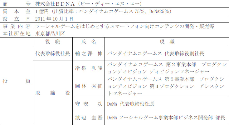 バンダイナムコゲームスとディー・エヌ・エーの共同出資による新会社「BDNA」が,10月1日付けで設立